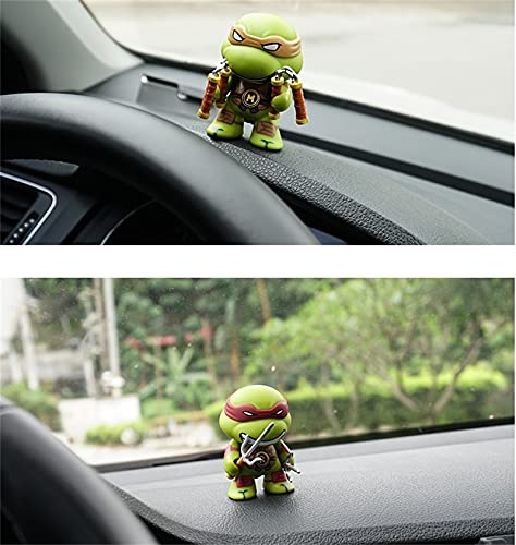 Vier schattige en energieke ninja-schildpadden die kleurrijke wapens dragen, worden in de auto geplaatst om de auto niet langer eentonig te maken.